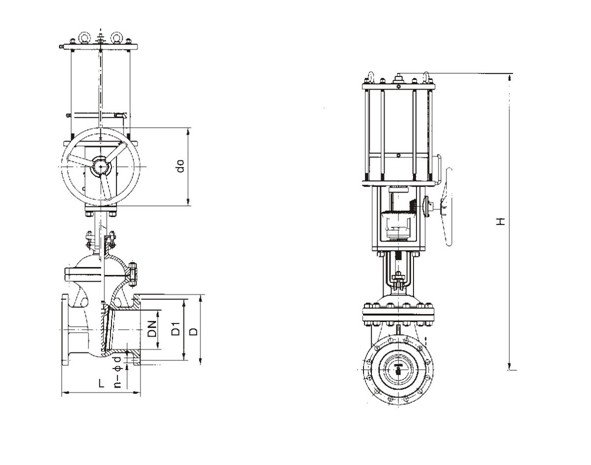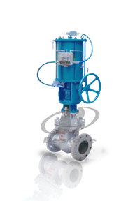 气动法兰闸阀具有性能可靠、操作切换和维修方便等特点。已被石油、化工、海运等部门广泛用于对各类介质控制。气动法兰闸阀配有气动执行机构和手动机构,闸阀执行器采用双层气缸结构,它与单气缸式气动闸阀相比,提升力增大了一倍,解决了单气缸式气动闸阀的某些阀板在阀体内楔死而打不开的弊病,具备缓冲机构,能有效地减轻关闭阀门时由于活塞下行冲击而造成的阀板密封面和阀体密封面的磨损,同时也能避免闸板卡死的现象。气动法兰闸阀可以配用电的或气的回讯器,用以发送阀门开关状态信息。可以实现远距离控制,集中控制和自动控制。气动法兰闸阀(带顶装手轮)气动法兰闸阀(带侧装手轮)