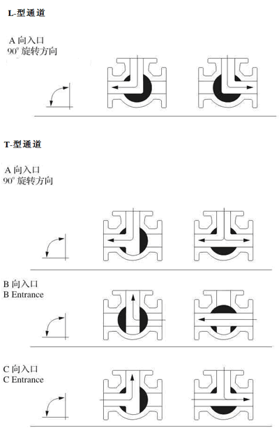 L型l流道的三通4面阀座球阀,采用2面阀座,受力平衡,保证闭上通道的可靠密封。主要用于流路的换向。T型流道的三通4面阀