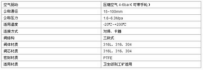阀体材质:304、316、316L 公称通径:DN15-150mm 压力范围:1.6Mpa 功能选项:防爆、开关 流体温度:-20℃-250℃ 适用介质:卫生级别工矿适用 连接方式:对焊、卡箍 行业应用:应用于 医疗器械、太阳能、清洗设备、食品机械、燃烧器、焊接切割、消防安全、生物制药、机械制造等行业